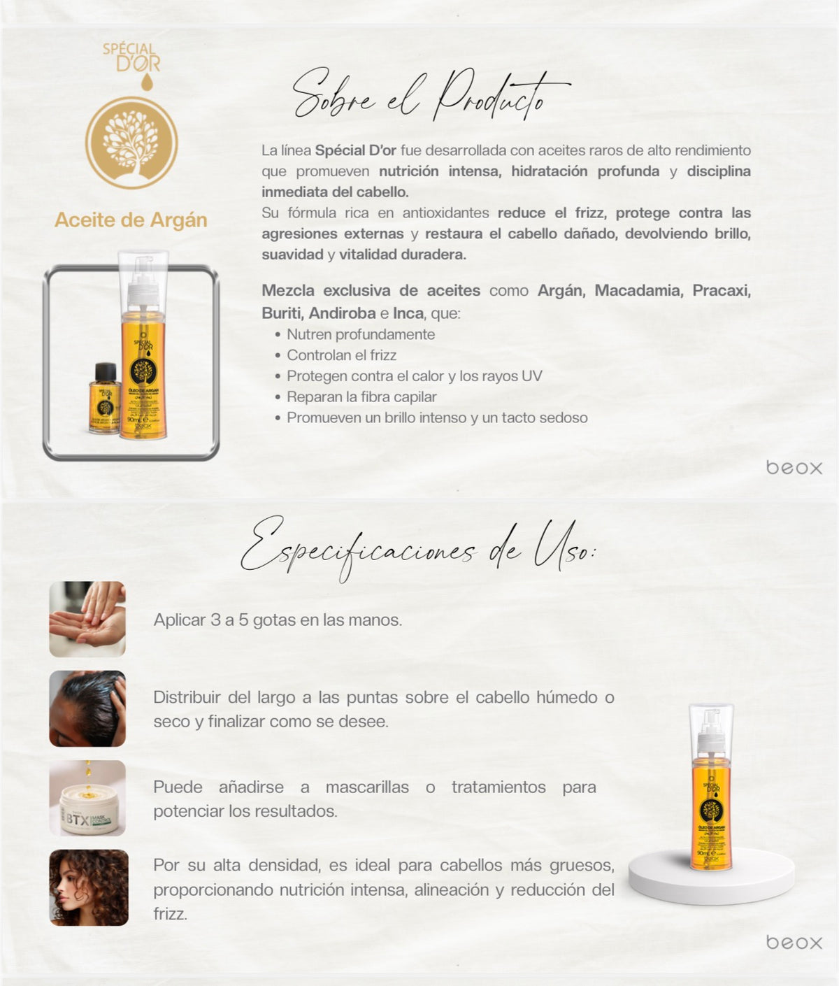 - Para una reparación máxima del cabello, añade de tres (3) a cinco (5) gotas de Aceite de Argán Spécial D'or en un producto para tratamiento capilar y/o procesamiento químico.